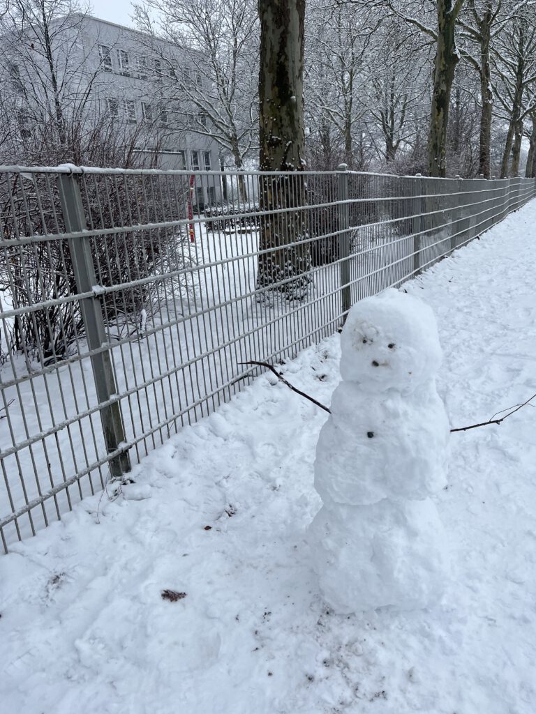 Schneemann, Schneemann, kalter Mann, hast `ne rote Nase dran. Schwarze Augen, schwarzer Mund, bist so dick und auch so rund. Kommt der warme Sonnenschein, wirst du bald geschmolzen sein.